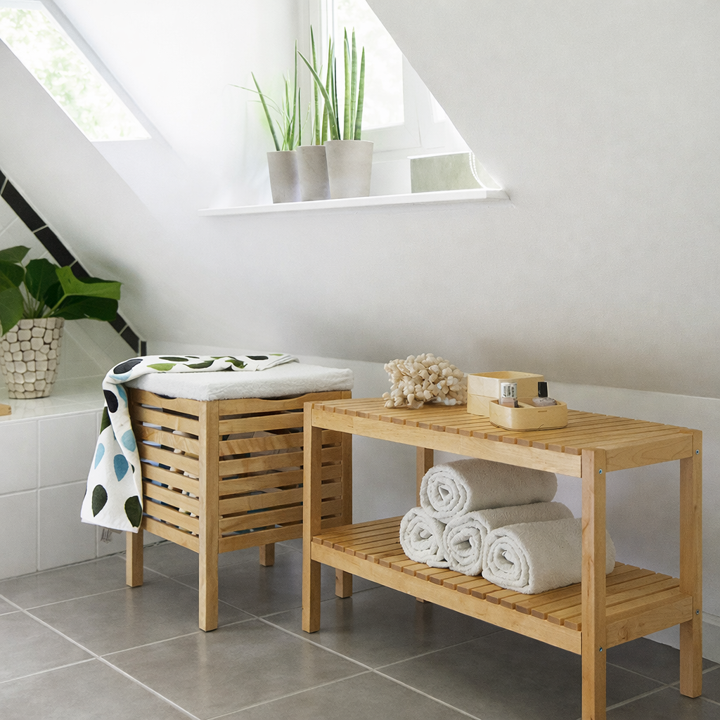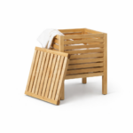 Bac à linge en bois naturel au design sobre et élégant, parfait pour organiser le linge tout en décorant votre intérieur.