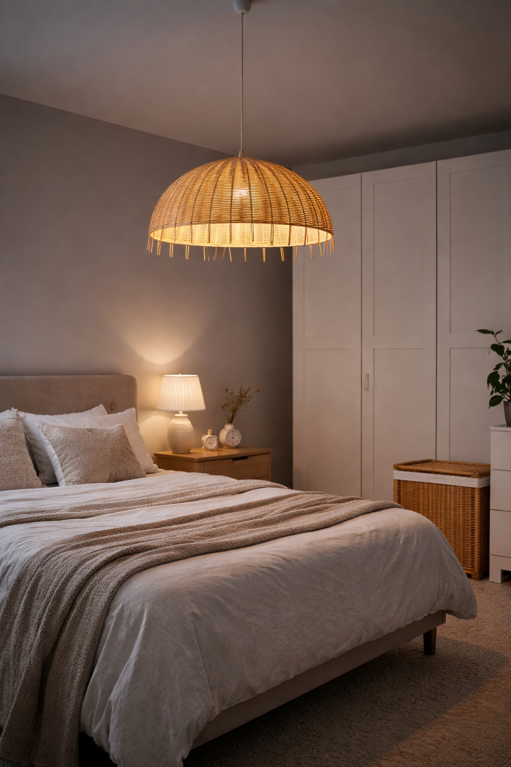 - Abat-jour en Rotin Naturel : Le rotin tissé à la main offre une lumière douce et tamisée, créant une atmosphère cosy et apaisante dans votre pièce.