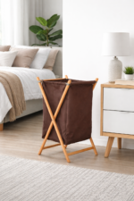 Panier à linge pliable avec structure en bois naturel et sac marron foncé en polyester épais (amovible et lavable). Format 34×70 cm, léger et facile à déplacer, idéal pour linge, jouets ou textiles. Livraison en Tunisie selon vos conditions.